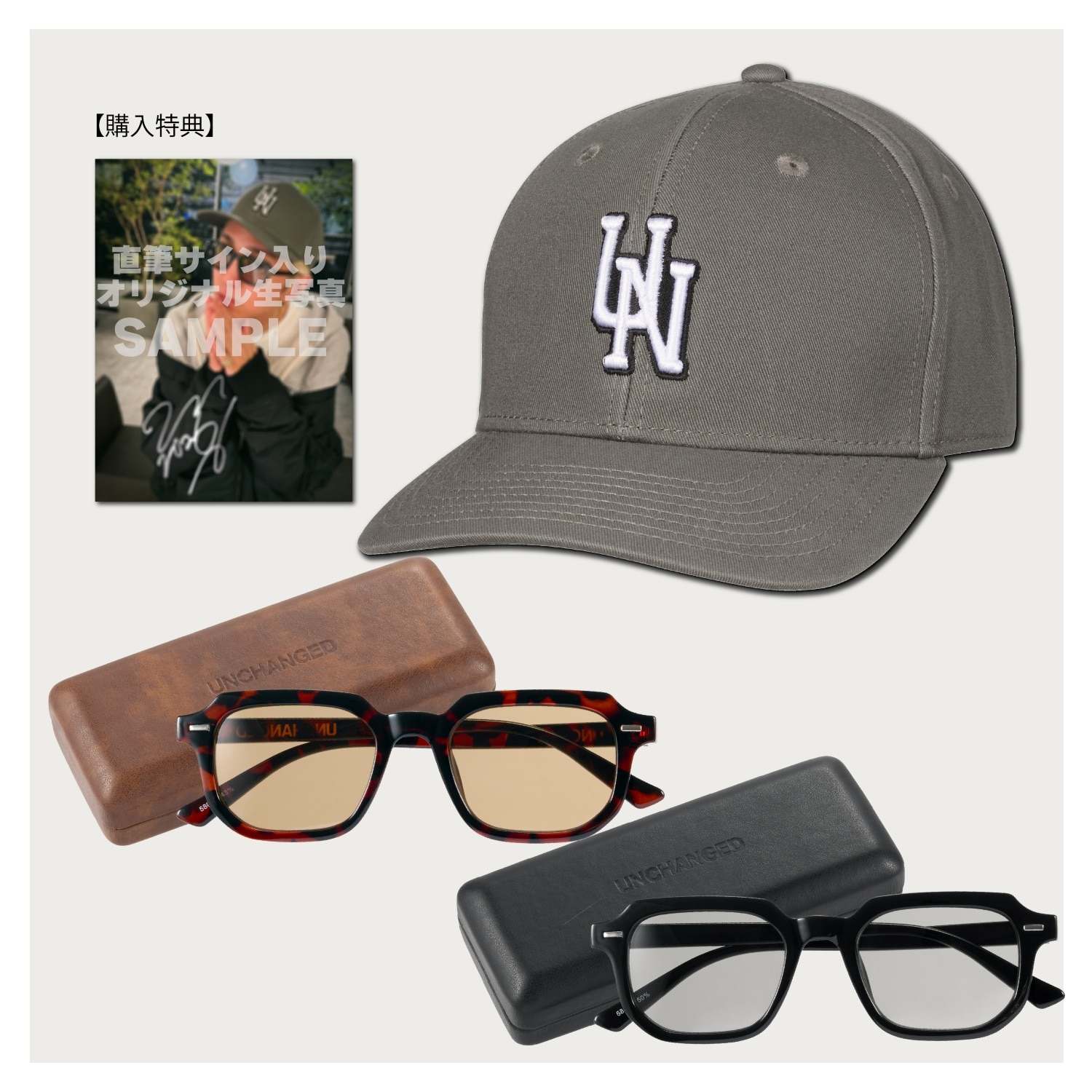 un capと un サングラス2色の3アイテムがセットになった“2026 SS un goods Complete set”。ご購入の方に先着で【直筆サイン入りオリジナル生写真】をプレゼント!CLOSE
